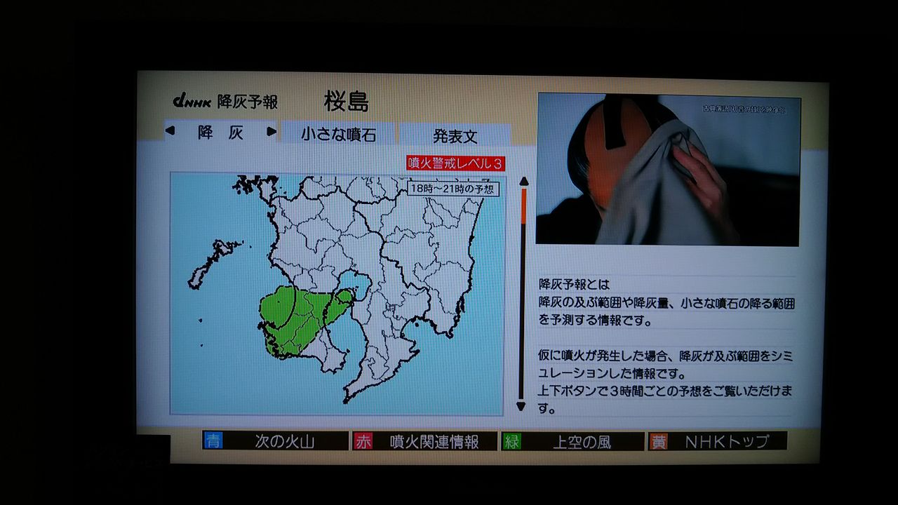 テレビでデータボタンを押すと、桜島降灰予報というのが常に見れるそうです。
